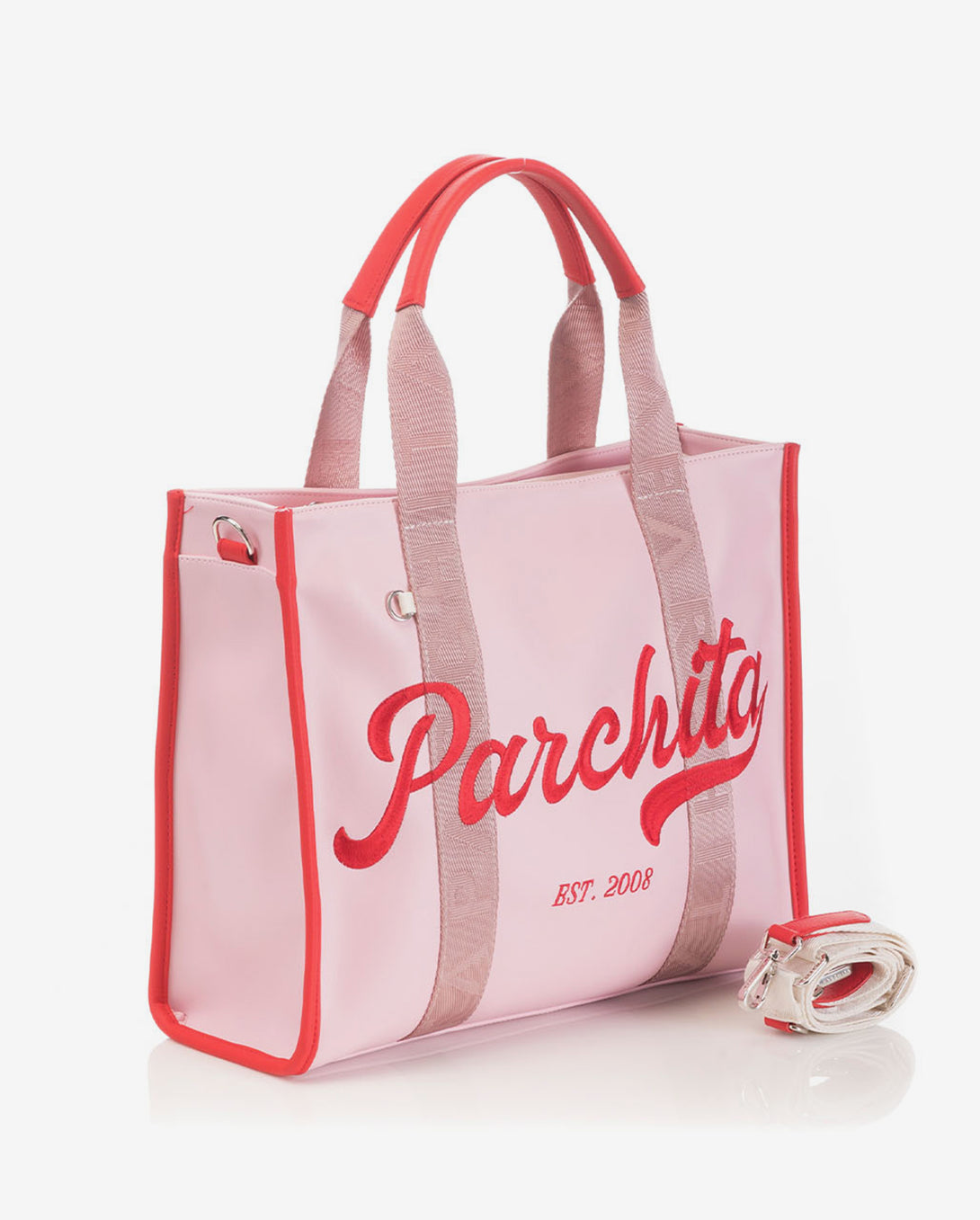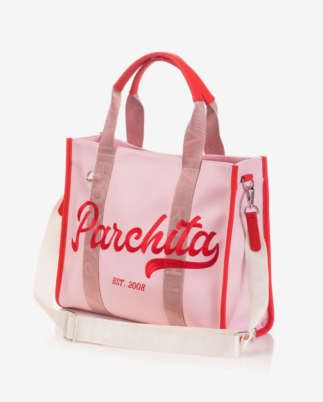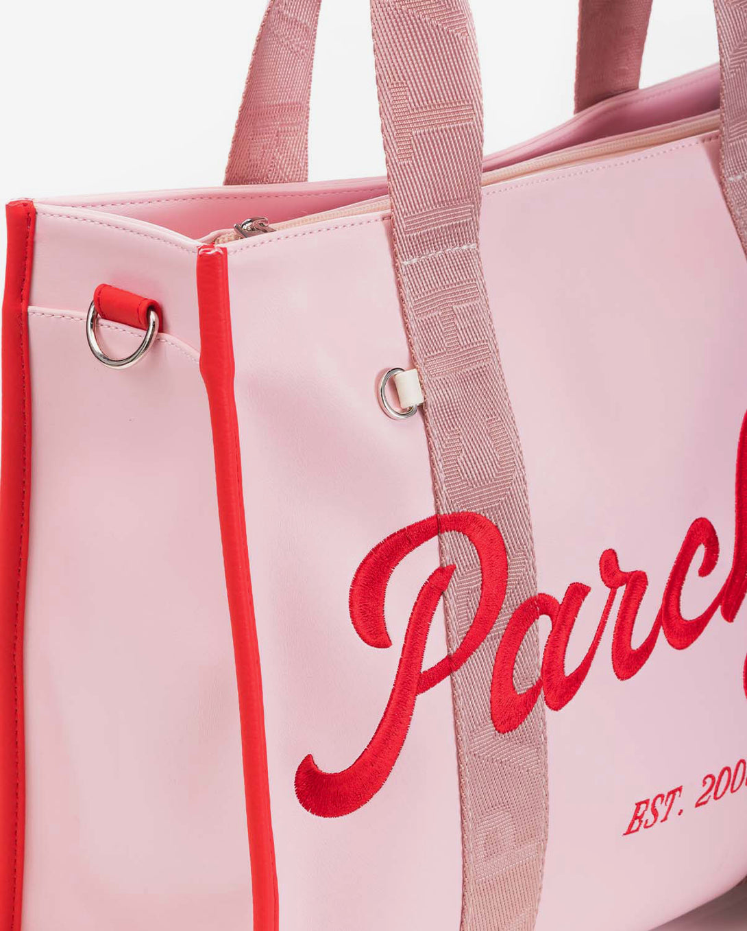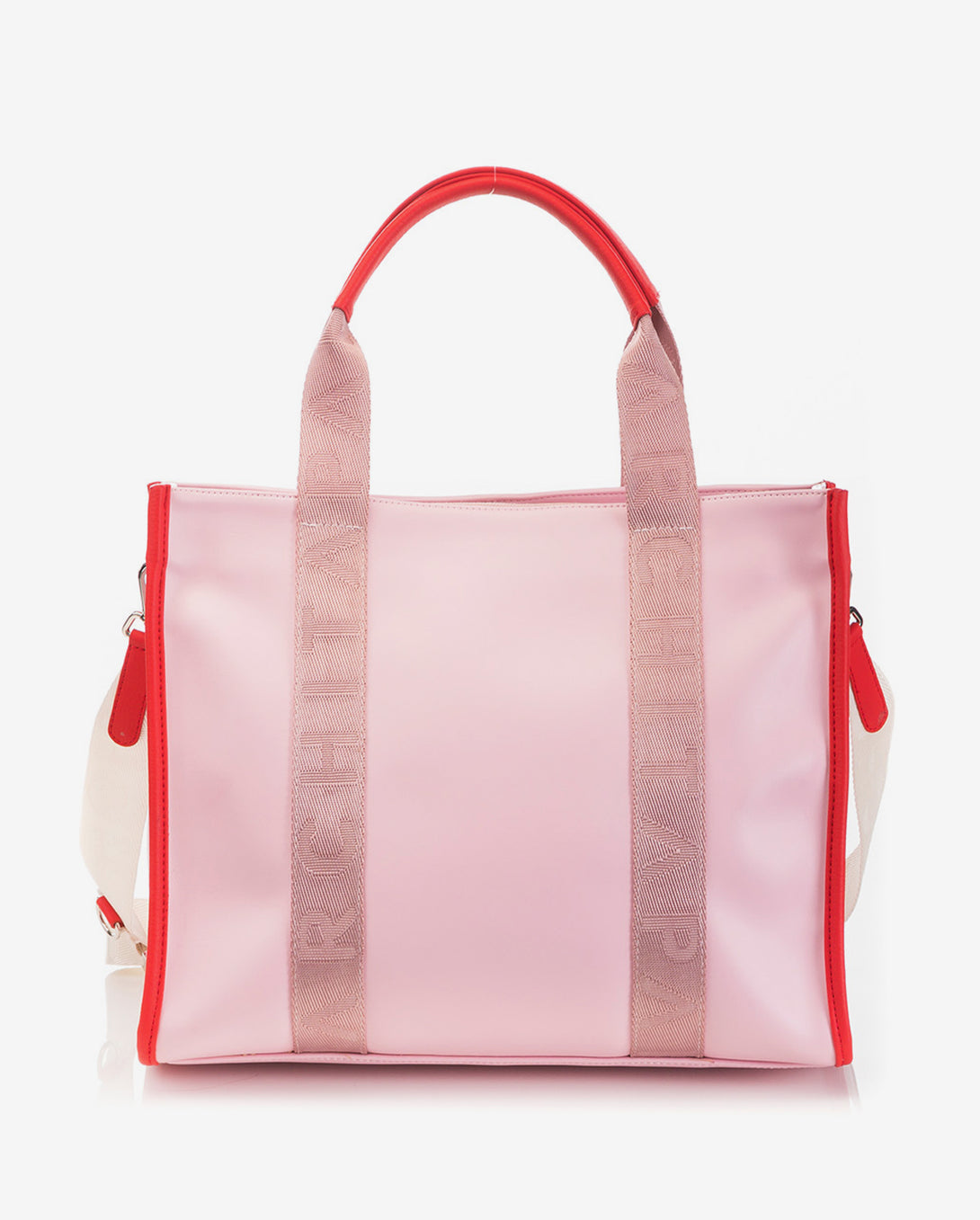Large pink PVC women's bag with internal pockets and adjustable strap