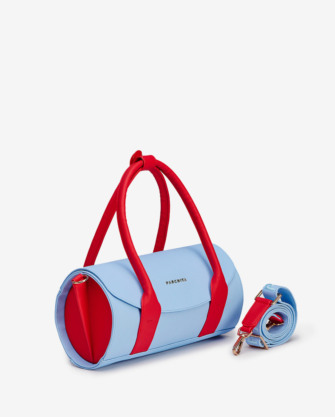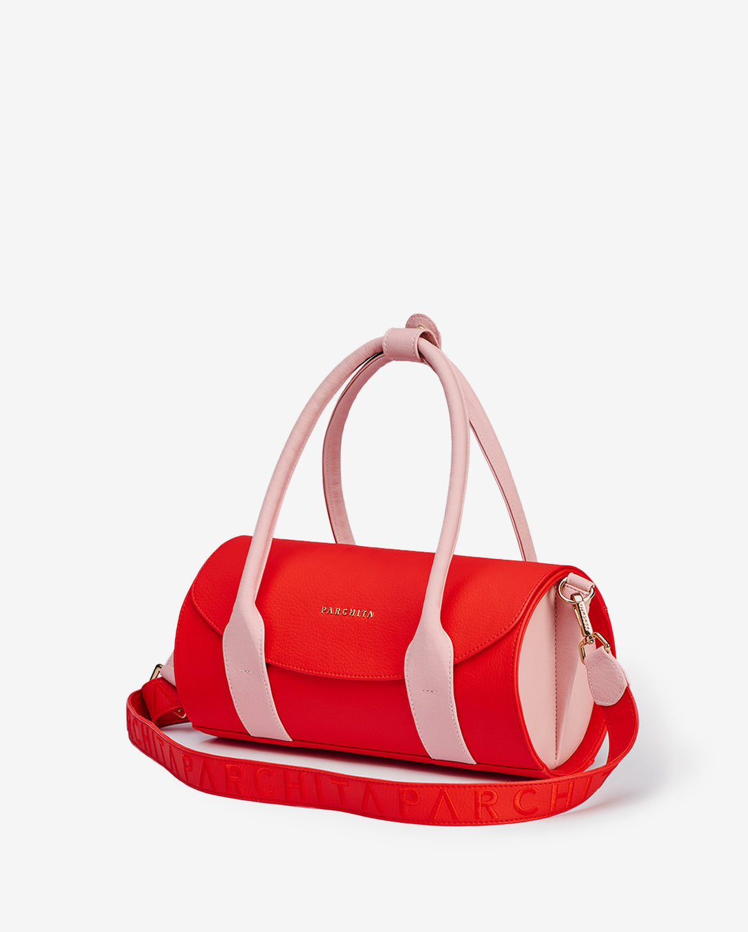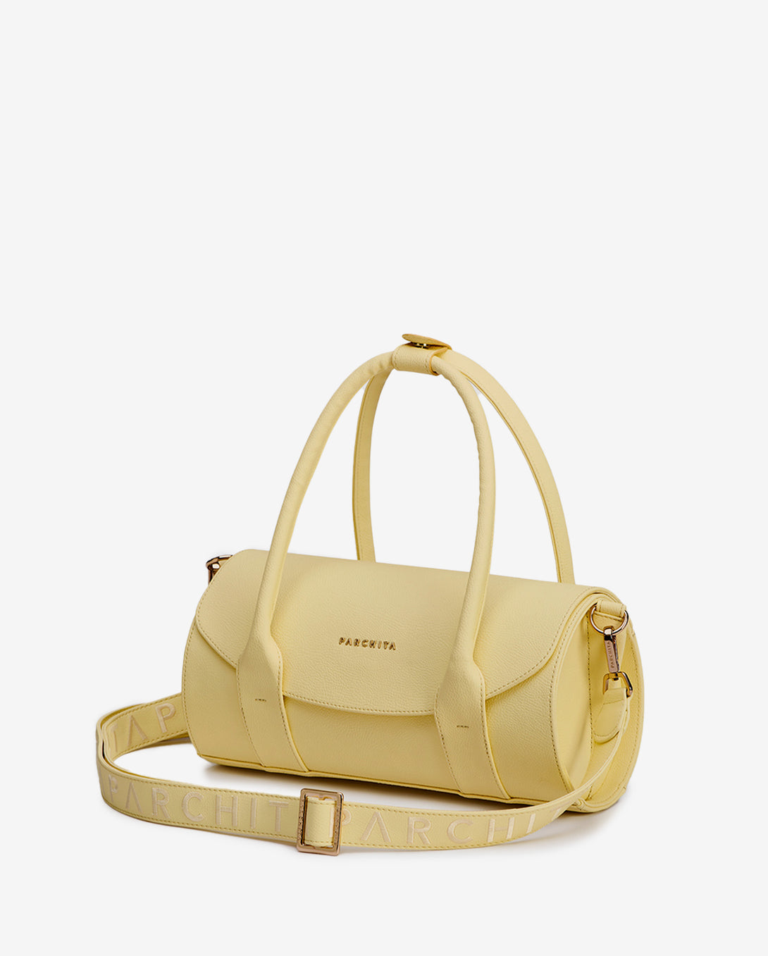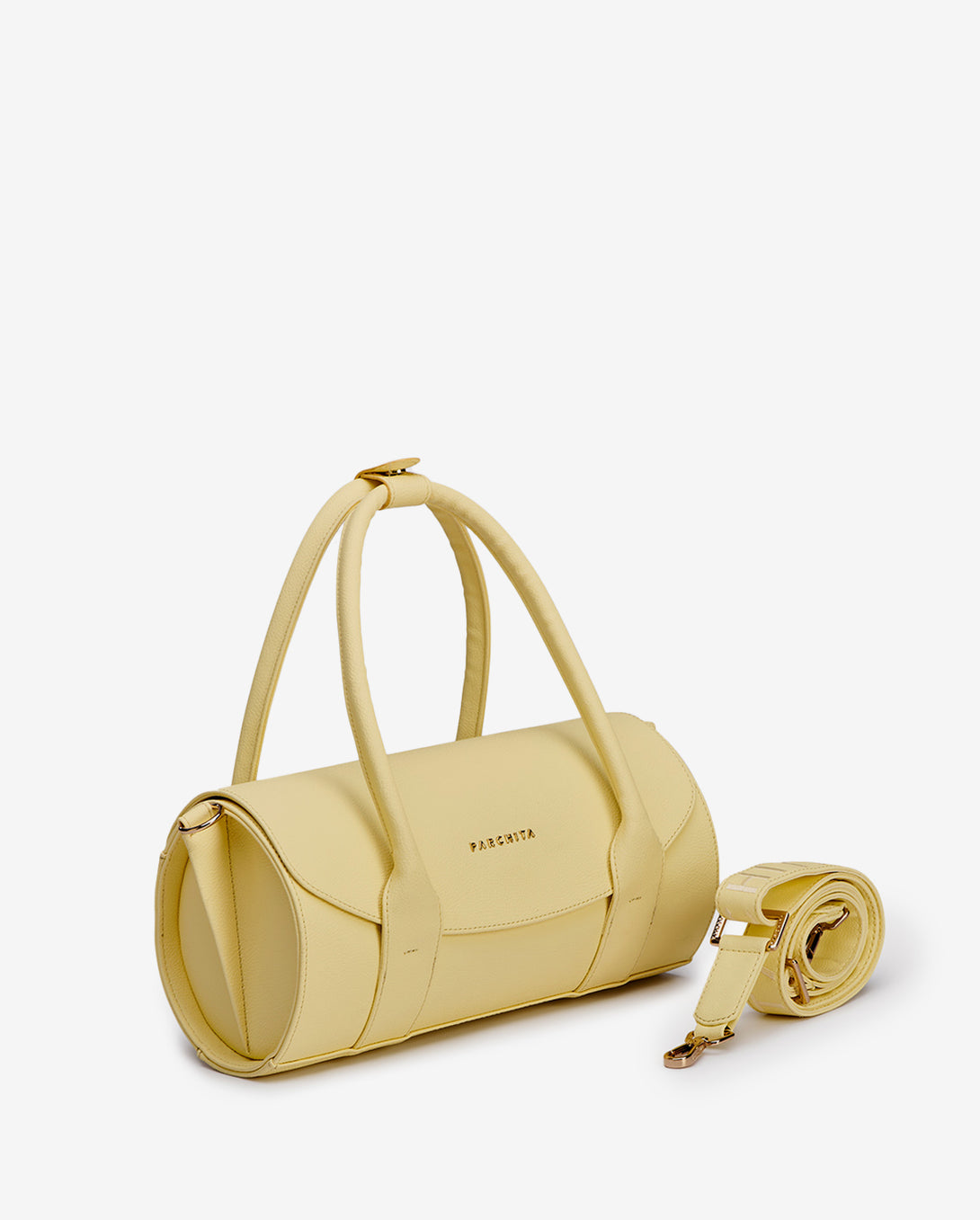 This cylindrical bag is the perfect balance of shape and style. It features double structured handles for hand carrying, a clasp, and an interchangeable strap for added versatility. It also features an internal zippered pocket with magnets for opening and closing. It's a striking piece and ideal for those looking for a practical bag with personality that easily adapts to different looks and moments of the day. Available in three colors.