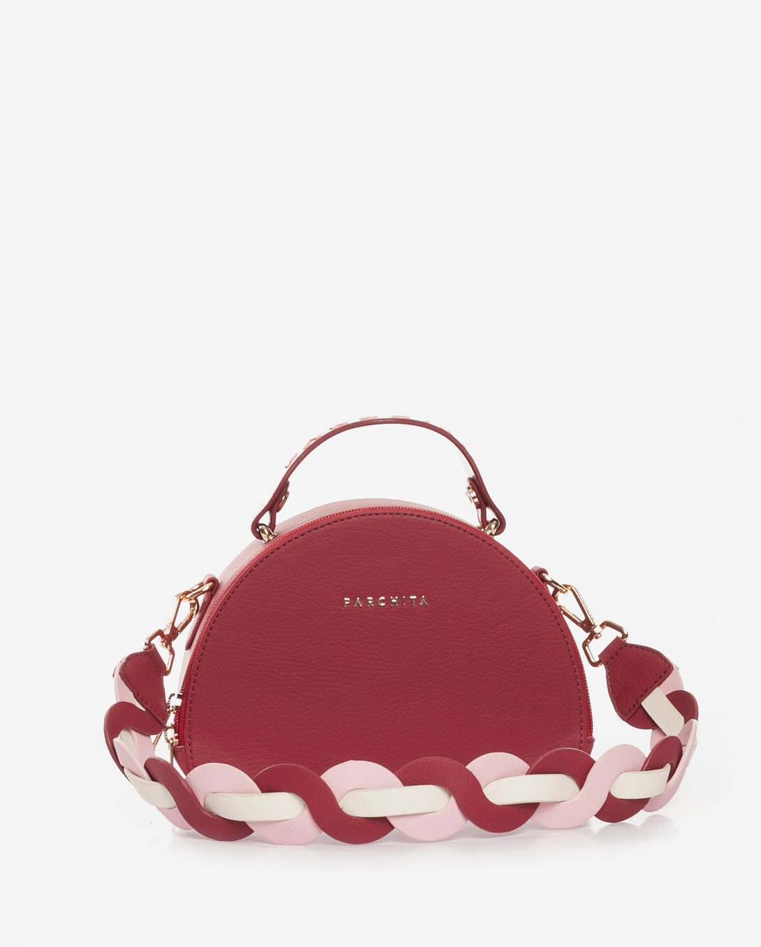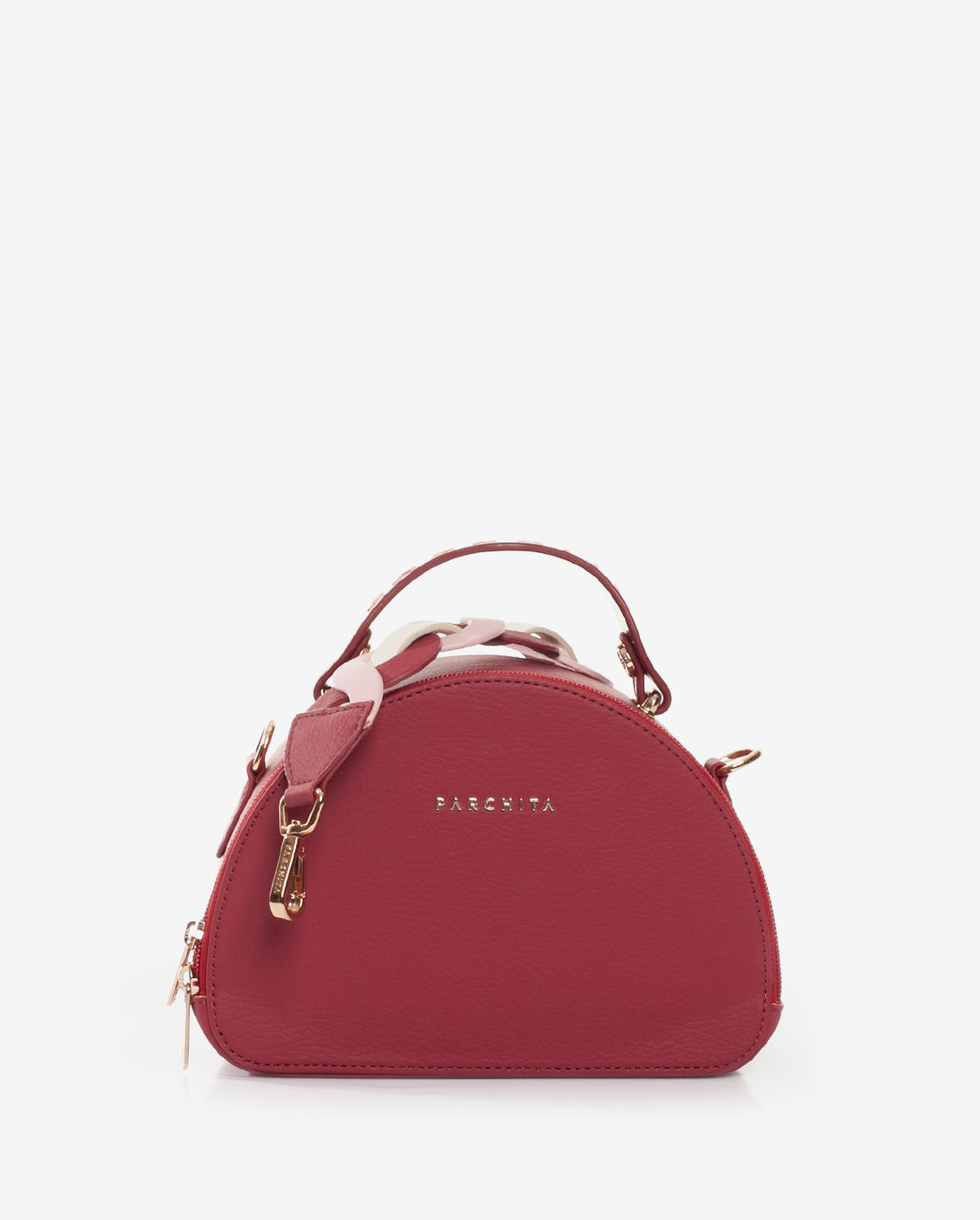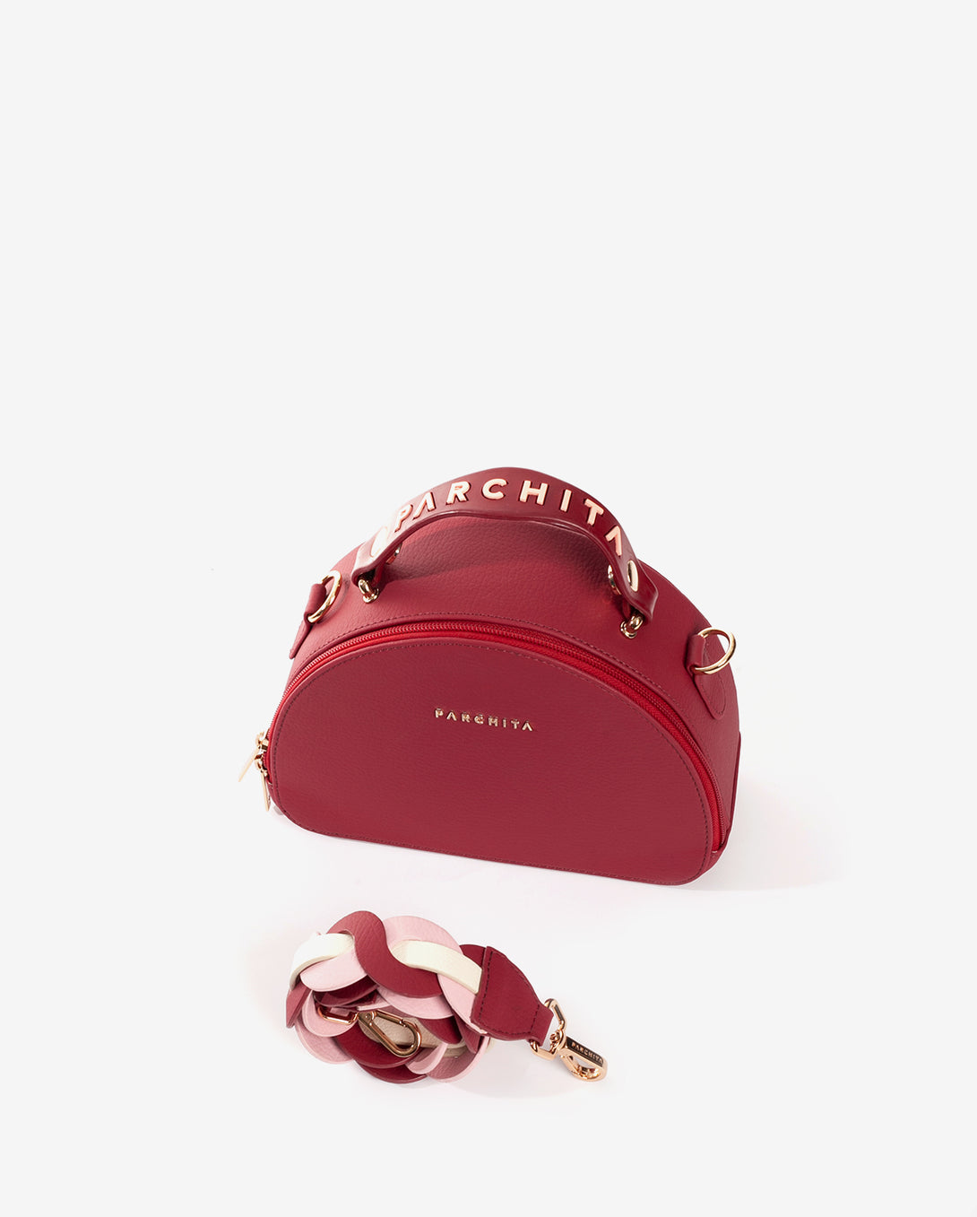 Cartera estructurada en PVC con silueta curva y base plana. Su diseño incorpora un doble cierre metálico y una manija en caucho con aroma a chicle, que destaca por su color en contraste, mientras que su bolsillo interno tipo parche en espaldar te permite llevar tus objetos organizados. Incluye un asa removible elaborada mediante el entrelazado de tres tonos, un detalle que equilibra la modernidad con la artesanía. Una pieza versátil y elegante, perfecta para elevar cualquier look con un aire contemporáneo, alegre y sofisticado.