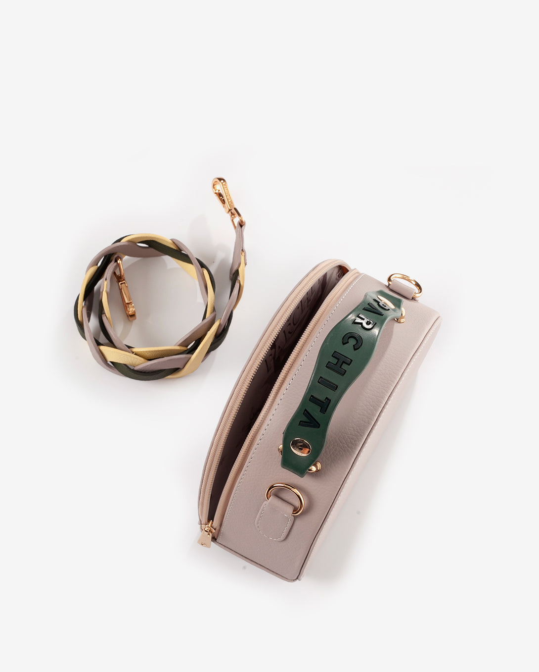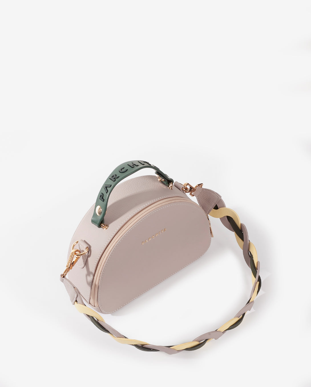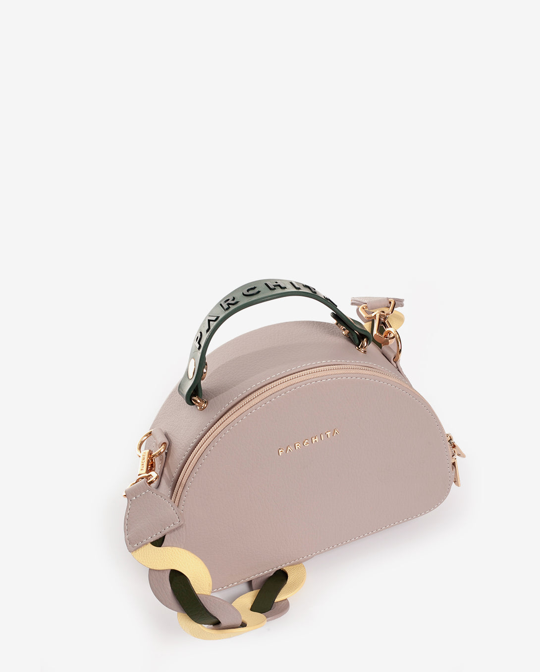 Cartera estructurada en PVC con silueta curva y base plana. Su diseño incorpora un doble cierre metálico y una manija en caucho con aroma a chicle, que destaca por su color en contraste, mientras que su bolsillo interno tipo parche en espaldar te permite llevar tus objetos organizados. Incluye un asa removible elaborada mediante el entrelazado de tres tonos, un detalle que equilibra la modernidad con la artesanía. Una pieza versátil y elegante, perfecta para elevar cualquier look con un aire contemporáneo, alegre y sofisticado.