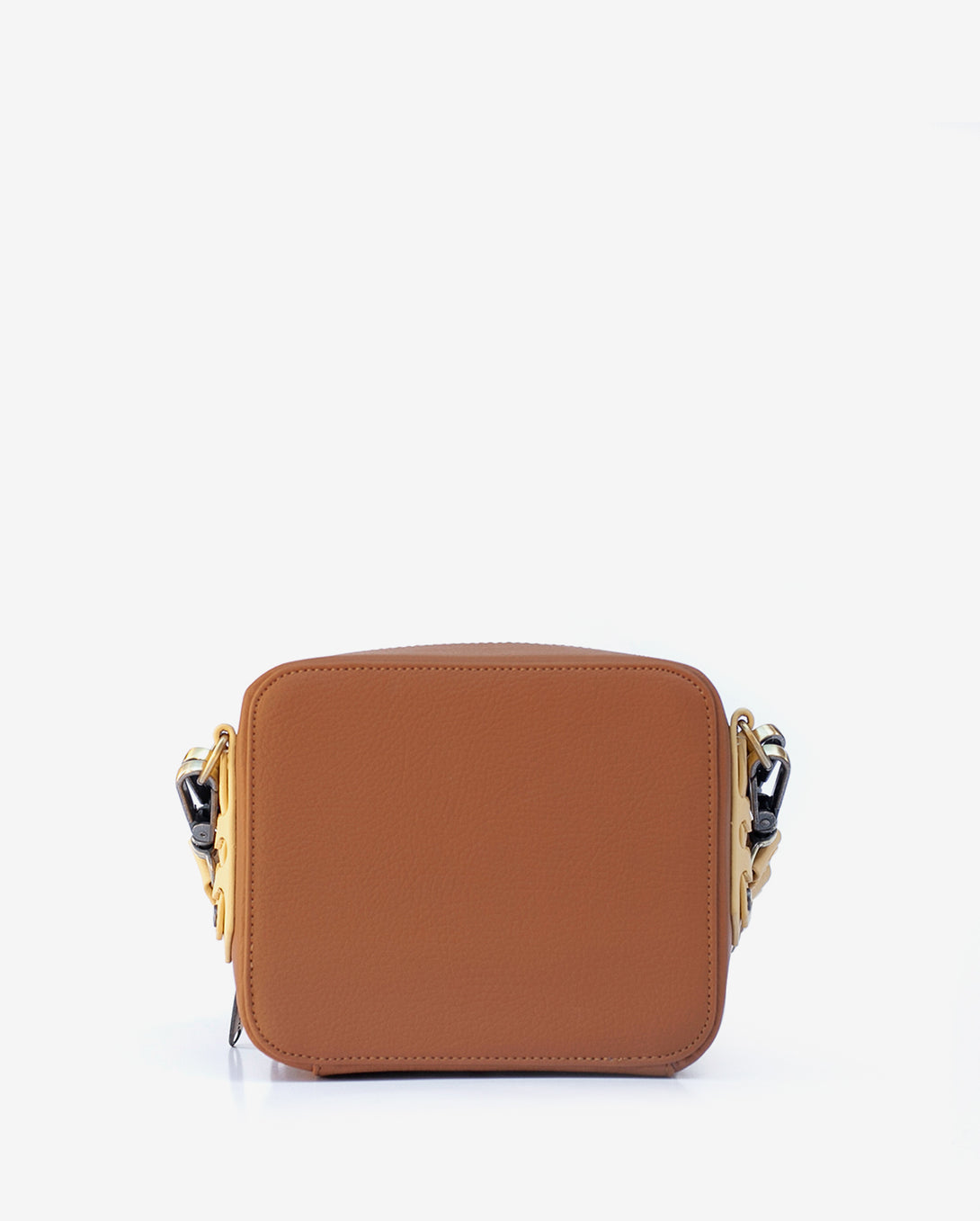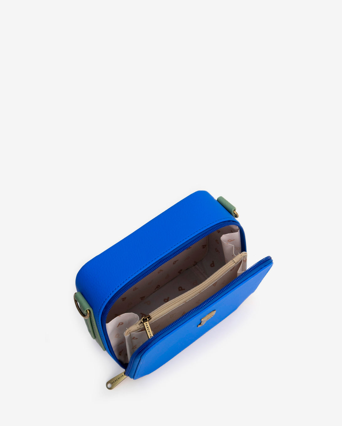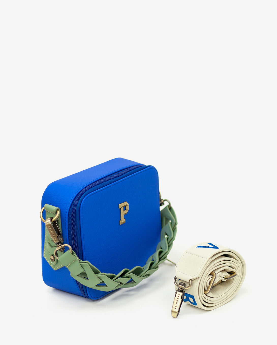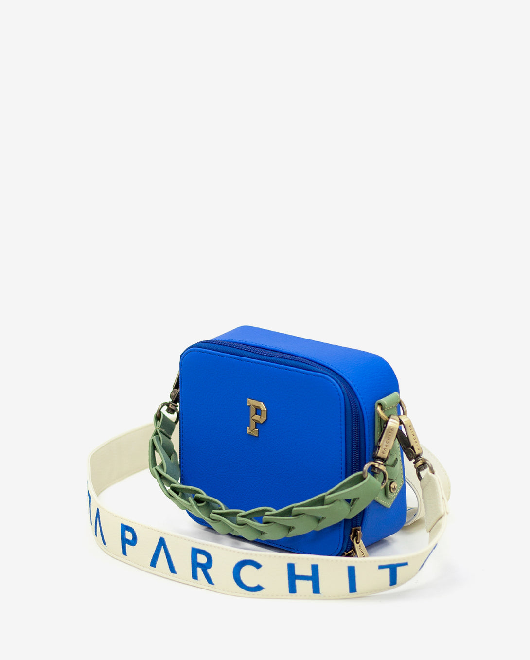 Small structured PVC wallet for women in a variety of colors with a chain handle and adjustable strap.